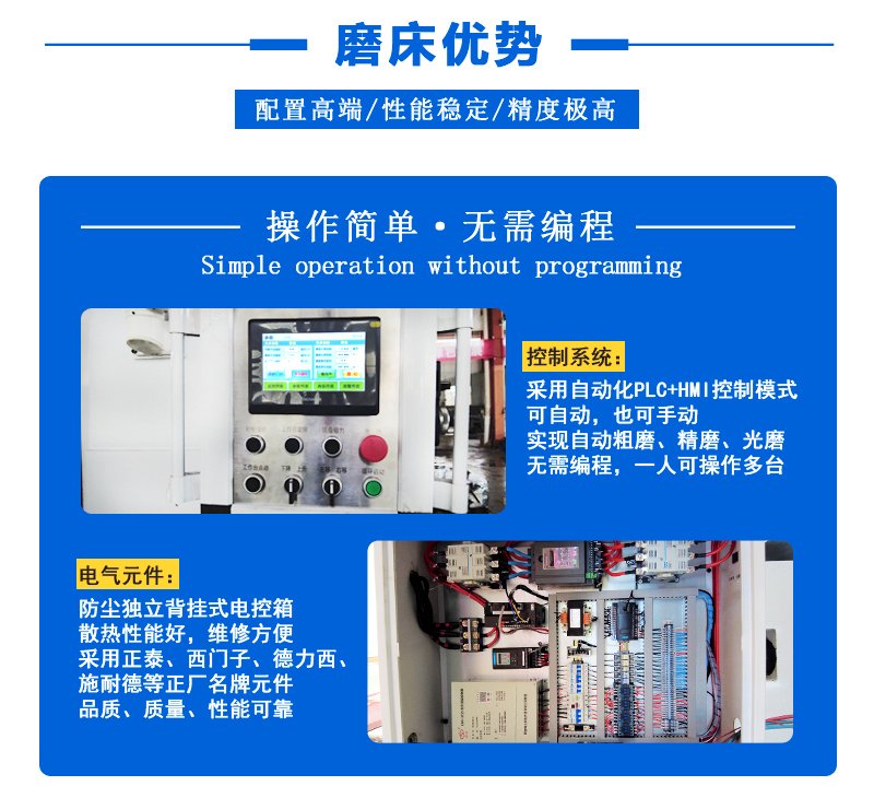 產品說明:MP74180/M74180立軸(zhou)圓臺(tai)平(ping)面(mian)磨(mo)床(chuang),以砂輪端面(mian)進(jin)行(xing)磨(mo)削(xue),是一種高效(xiao)率,精密穩(wen)定的(de)加工(gong)機床(chuang)。該系列(lie)磨(mo)床(chuang)在提高床(chuang)身和磨(mo)頭剛性(xing)做了較(jiao)大的(de)改進(jin)。立軸(zhou)采用三點調(diao)(diao)整,結構緊湊,工(gong)作臺(tai)為圓形(xing)強(qiang)力電磁吸盤,磁力平(ping)滑(hua)可(ke)(ke)調(diao)(diao),精度穩(wen)定。功(gong)率大,可(ke)(ke)控硅充退磁,并配有(you)冷卻(que)液凈化裝置等(deng)特點。該系列(lie)機床(chuang)主(zhu)要用來磨(mo)削(xue)毛坯及一般精密的(de)大型(xing)零件,表(biao)面(mian)粗糙度達0.8以上,平(ping)行(xing)度0.02/1000mm以內(nei)。